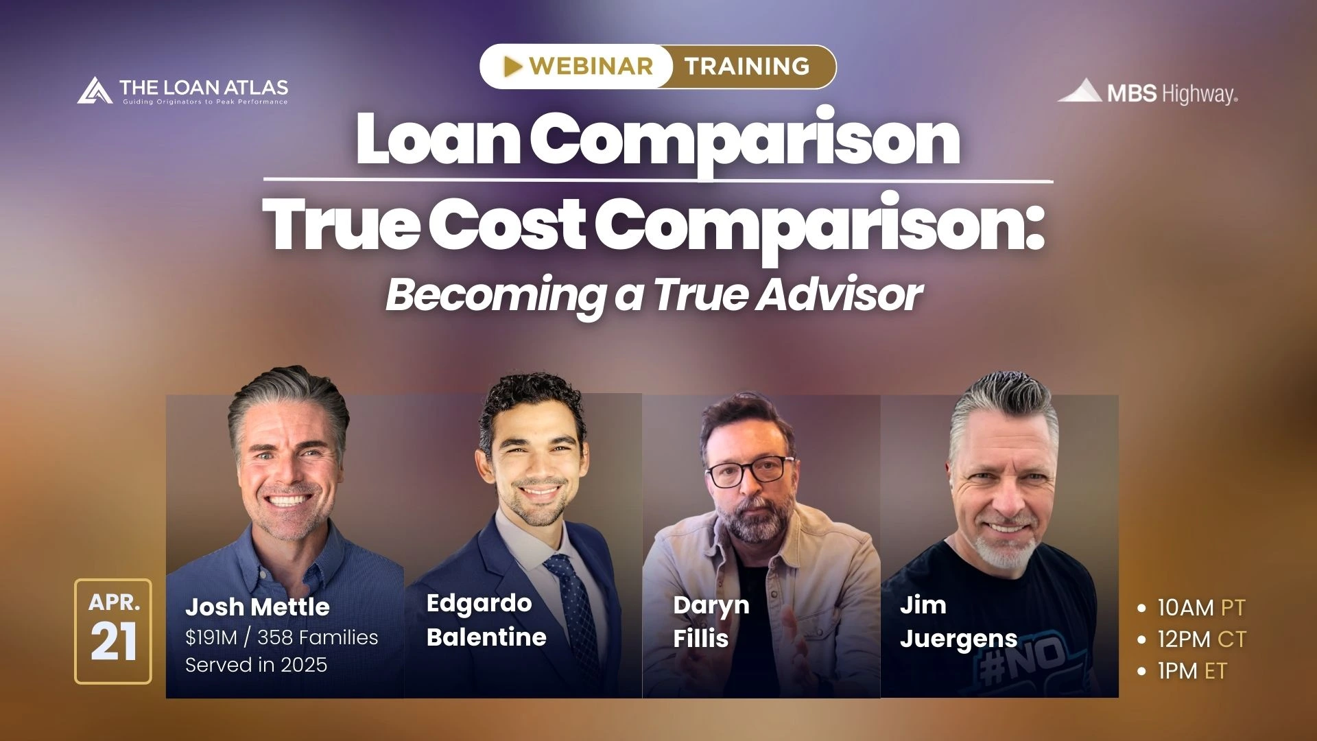 Time: 10:00AM (PT), 12:00PM (CT), 1:00PM (ET)Loan Comparison/True Cost Comparison: Becoming a True Advisor